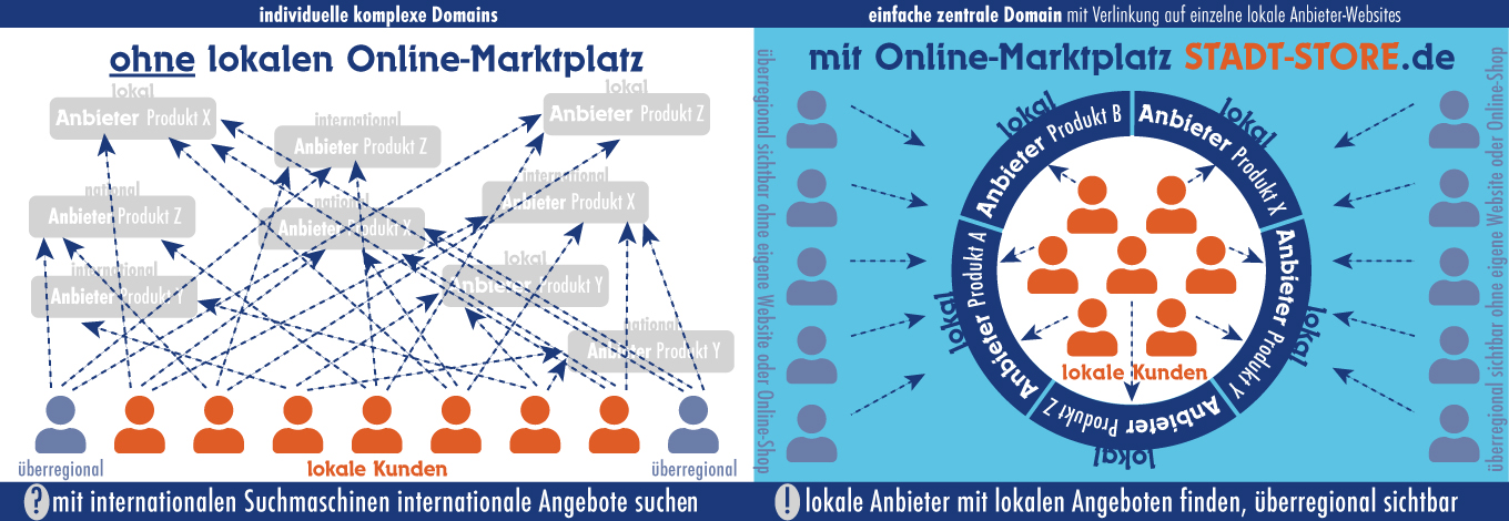 Die Frage ist recht einfach zu beantworten, die Marktplätze auf www.rems-murr-lokal.de, wie z.B. winnende.store sind lokal und regional relevant. - Warum? - Sie bilden dort das lokale, bzw. regionale Angebot Ihres Unternehmens ab. Verfügbarkeit und persönliche Leistung. Und - vergleichen Sie die Situation mit der obenstehende Grafik - wir bieten mit dem "Online-Marktplatz" allen Nutzern einen ganz einfachen Zugang zum Marktplatz ihrer Stadt/Region - und jetzt schauen Sie Domains an, vielleicht Ihre eigene. Genau, die muss man erst einmal kennen und dann ggf. sogar noch richtig schreiben, das wird dann interessant, wenn Ihr Firmenname einen Umlaut enthält oder wie im deutschen oft üblich, für eine Aussprache x-erlei Schreibweisen zu Verfügung stehen.